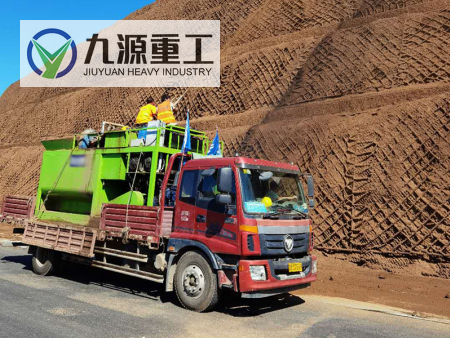 噴播機是應用于邊坡綠化的專業(yè)設備,通過本設備將土壤基質、綠化草籽、保水劑、黏合劑、肥料等,在噴播機攪拌罐中與水混合成膠狀的漿液,用泥漿泵將其噴播于坡面上。由于漿液中含有保水材料、黏合材料、各種養(yǎng)分,在保證了植物生長所需的水和其它營養(yǎng)物質來源的同時有效防止雨水沖刷對噴播材料的破壞,故而植物能夠健康、迅速地成長。